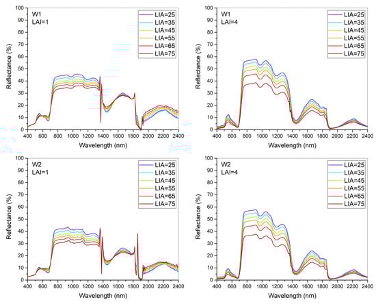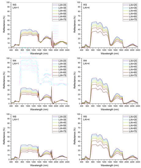 The canopy reflectance varied with LIA under different LAI when other coefficients were set as shown in Table 4. From Figure 8, the canopy reflectance declined with the increase in LIA under all treatments and different LAI, especially in the near-infrared spectrum when setting LAI as 4.