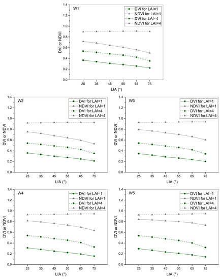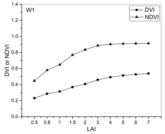 Based on the parameters shown in Table 4, the spectral reflectance under different LAI was simulated, and then the corresponding DVI and NDVI values were calculated by Formulas (1) and (2), respectively. As shown in Figure 10, both DVI and NDVI decreased with the increase in LIA, except when the canopy was closed, when the NDVI became saturated.