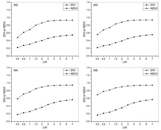For DVI, the slope varied from 0.17 to 0.2 when LAI increased from 0.5 to 0.8. Then, when LAI was greater than or equal to 4, the slope of the DVI curve started to decrease and reached 0.01 when LAI was 7 for most treatments. When the canopy was not closed, the DVI value in each treatment presented the changing trend of W1 < W2 < W3 < W4 < W5. However, when the canopy was closed, the trend of DVI value in each treatment was displayed as follows: W1 > W2 > W3 > W5 > W4. The difference between the highest and lowest value of the DVI in each treatment followed the order of: W1 > W2 > W3 > W4(CK) > W5. This is because, when the canopy is not closed, the canopy reflectance is mainly affected by soil reflectance, and the reflectance difference between red light and near-infrared light is significant. However, when the canopy is closed, the canopy reflectance is mainly affected by the plant spectrum; then, the reflectance difference between red light and near-infrared light in each treatment is not as significant as when the canopy is not closed.