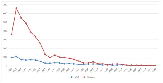 Figure 1, for the different number of documents presented by WoS and Scopus, highlights that there is a similar trend (to its scale) in the documents published over the last decades by these databases (with the Scopus having more documents in recent years), reaching a maximum in 2019. In fact, in 2020 it seems that there was a change in the focus of the researchers in some cases and a reduction in the total production of research in other contexts. In any case, these records were obtained on 11 December 2020 and this has influence in the number of documents obtained for 2020.