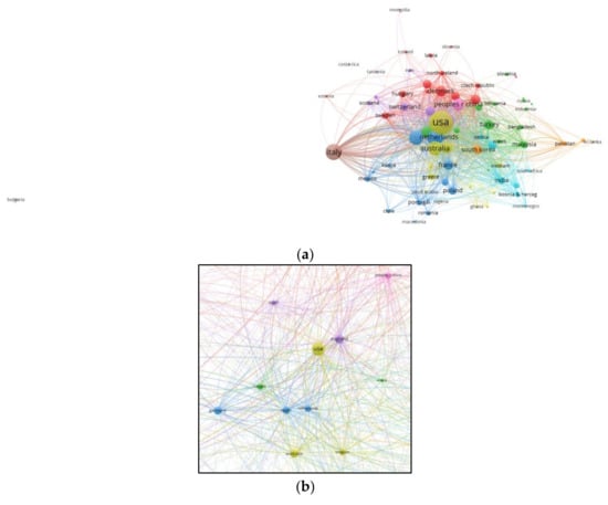 Network visualization map for the item countries (1 as the minimum number of documents of a country). (a) Original figure. (b) Enlargement of figure around the USA.