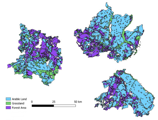Uckermark (UM) covers an area of 3076.93 km2 with 118,947 inhabitants [32]. In 2019, the agricultural area covered 1766 km2 [27], of which 83% is used for crops, and 16.6% for grassland. Forest area covers 748 km2 or 24% of the total area.