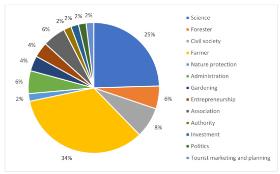 We collected a total of 53 complete questionnaires, of which 30 were collected in MOL, 14 in UM and 9 in OPR. The sample population was 40% male, 30% female, 2% diverse and 28% of the participants did not answer the gender question. Age distribution ranged between 21 and 80. Regarding affiliation with stakeholder groups, 34% selected farming and agriculture, 24% selected the stakeholder category of science, and 8% were related to civil society (Figure 2).