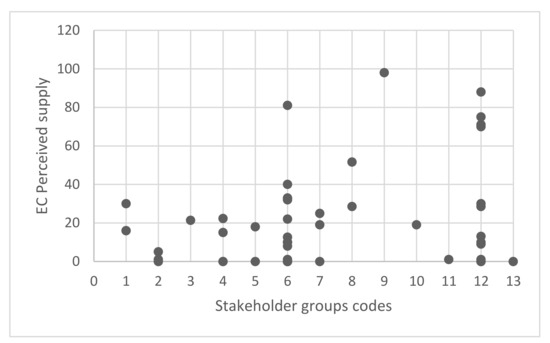 Scatter plot between the supply of erosion control (EC) perceived and coded stakeholder groups to display the correlation between the two variables.