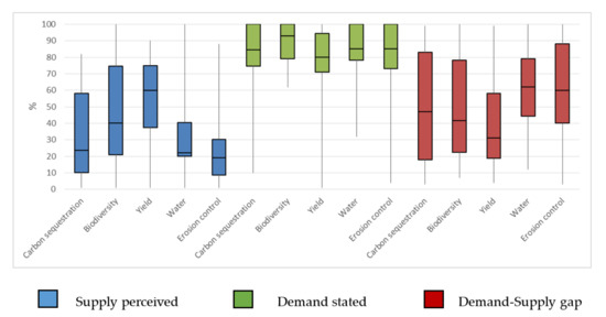 Figure 4 shows a boxplot comparing the supply perceived, demand stated and the gap for all ES values. The boxplot shows the dispersion of data for the three variables, which are stretched between 0 and 100 for almost all ES. However, the median value of the supply perceived is about 20% for carbon sequestration, water availability and erosion control, which is also very close to the 1st quartile value, indicating an agreement on a narrow value between 10 and 20%. Meanwhile, the demands for these ES comes in between 70 and 85%, which is justified by a gap ranging from 40 to 60%. On the contrary, it is more likely to lie between 60 and 75% for the supply of yield perceived with a close value of demand (75–80%), which makes the gap very small (about 20%). Surprisingly, the demand for biodiversity shows a high agreement between 90 and 100% and a low perceived supply (20–40%). The high dispersion between the median and the 1st or 3rd quartile or between the minimum or maximum value and the 1st or 3rd quartile, respectively, suggests some outlier data that might have originated from the low awareness of the participants about the status of the ES in the CSAs.