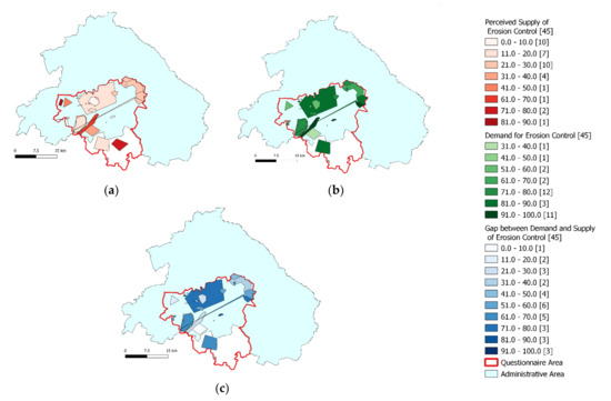 Supply perceived (a), demand stated (b) and the gap (c) for erosion control in MOL.