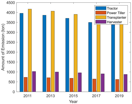 - Shin, C.S.; Park, T.S.; Hong, D.H.; Kim, T.H. Analysis of Air Pollutant Emissions from Agricultural Machinery in South Korea. J. Korean Soc. Manuf. Process. Eng. 2019, 18, 14–25. [Google Scholar] [CrossRef]