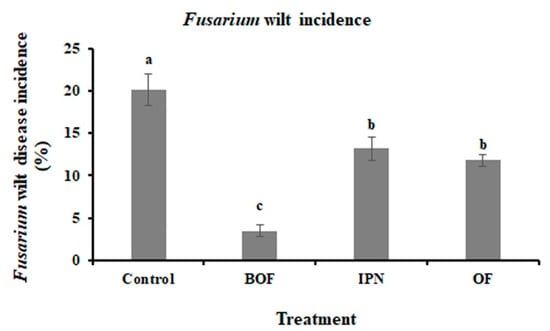 The incorporation of PGPR or antagonistic microbes into organic fertilizers to obtain BOF formulations provides a low cost, environmentally friendly and sustainable agronomic option as they contribute effectively to the mobilization, mineralization and recycling of nutrients [], increase plant productivity [] and also prevent soil-borne diseases (Fusarium wilt disease) by modifying soil microbial properties [].