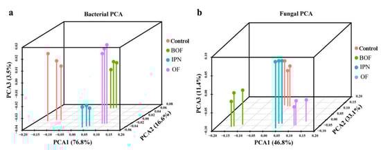 The structure of the rhizosphere soil microbiome as affected by the various soil treatments. PCA of (a) the bacterial and (b) the fungal components.