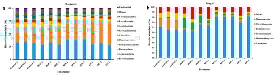 The relative abundance of microbial phyla in the rhizosphere soil as affected by the various soil treatments. (a) Bacterial phyla, (b) fungal phyla. ‘Others’ are low abundance (<0.5%) phyla.
