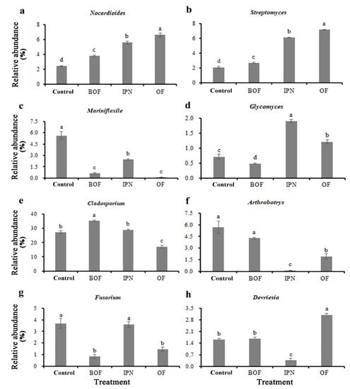 Based on the ten most abundant bacterial and fungal genera, all treatments tested showed different patterns of bacterial and fungal community structure. Fold-change calculations were further used to visualize the variations of genera in OF, IPN and BOF. In bacteria, the relative abundances of Nocardioides and Streptomyces increased while Mariniflexile (Figure 5c) decreased significantly in all treatments compared to the control (Figure 5a,b); BOF application decreased the abundance of Glycomyces (Figure 5d) significantly. In fungi, the relative abundance of Arthrobotrys decreased in all treatments while the abundance of Cladosporium increased significantly in BOF (Figure 5e,f). OF and BOF application significantly reduced the abundance of Fusarium (Figure 5g), and IPN treatment reduced the relative abundance of Devriesia compared to the other treatments (Figure 5h).