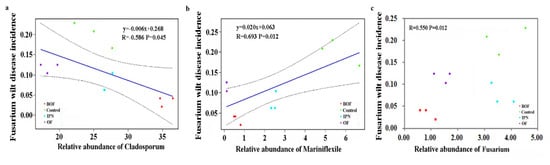 Linear regression analysis illustrating the correlation of the incidence of Fusarium wilt with the relative abundance of (a) Cladosporium, (b) Mariniflexile and (c) Fusarium in the soil sampling of chrysanthemum monoculture greenhouse.