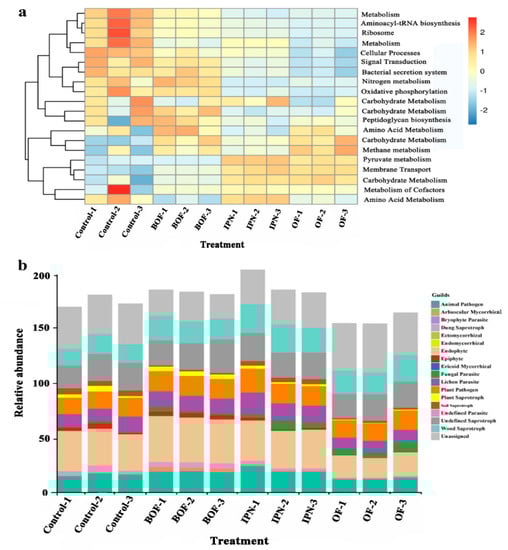Functional profiles that were predicted from 16S rRNA genes are shown in Figure 7a. Soil microbiome functions increased in the BOF and OF treatments compared to the control, which was related to signal transduction, bacterial secretion system, metabolism of carbohydrate, nitrogen and amino acids and oxidative phosphorylation. The soil microbiome functions that increased in the IPN treatment were related to membrane transport and metabolism of pyruvate, cofactors, amino acids and carbohydrate. Soil microbiome functions related to metabolism and to ribosome and aminoacyl-tRNA biosynthesis were highest in the control. ITS2 gene-predicted functional profiles revealed that arbuscular mycorrhizal and endophyte classes were significantly increased under BOF treatment, while soil saprotrophs were obviously decreased under BOF compared with other treatments (Figure 7b).