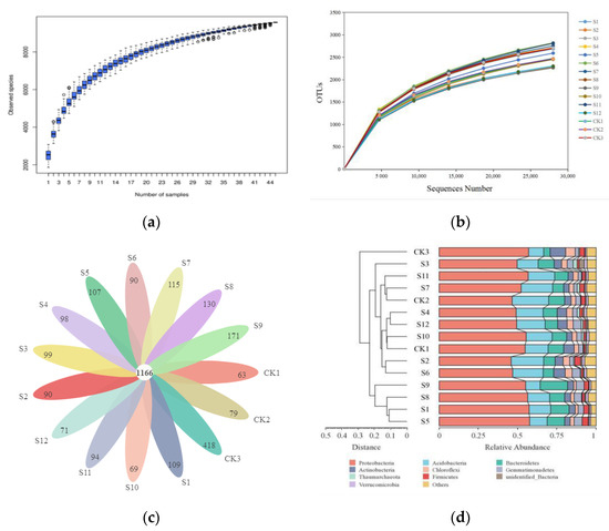 Differences in soil microorganisms among different strains after decomposition. (a): the species accumulation box plot; (b): the dilution curve; (c): the petal diagram; (d): the clustering stacked histogram.