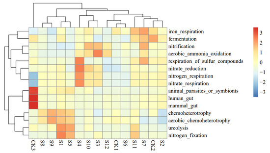 The functional analysis of each sample community obtained by the FAPROTAX software (Figure 2) showed that the first 15 types of functions were primarily types of nitrogen metabolism. Compared with the original soil, the abundance of genera related to nitrogen metabolism in the decomposed soil was higher, while the abundance of animal parasitic or symbiotic bacteria and animal human intestinal microflora was lower. This differed from the abundance of microbial functional categories for the soil in which the rapeseeds had decomposed. The original soil (CK3, Table 2) and the decomposed soil clustered into two branches, indicating that the main functional groups of soil microorganisms had clearly changed.