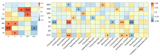 Correlation analysis between environmental factors and soil nutrients and microorganisms. DW: dry weight; GLU: glucosinolate content; AD: accumulative decomposition rate; NRR, PRR, and KRR: the cumulative release rate of nitrogen, phosphorus, and potassium, respectively; TN, TP, and TK: the contents of soil nitrogen, phosphorus, and potassium, respectively. Asterisks denote statistical significance at the p < 0.05 (*) and p < 0.01 (**) level.