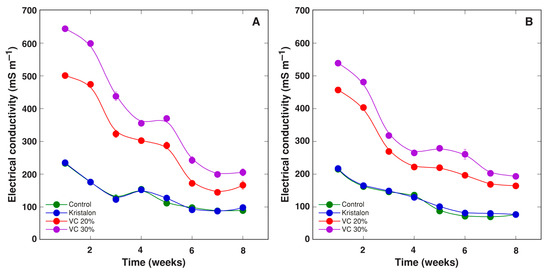 Changes of substrate electrical conductivity as affected by mineral fertilizer (Kristalon) and amendment with vermicompost (VC) at a 20% and 30% (v/v) rate during cultivation of Dracocephalum moldavica plants in peat substrate (A) or commercial garden soil (B). Results are means ± SE from five replicates for each treatment, four measurements per replicate.