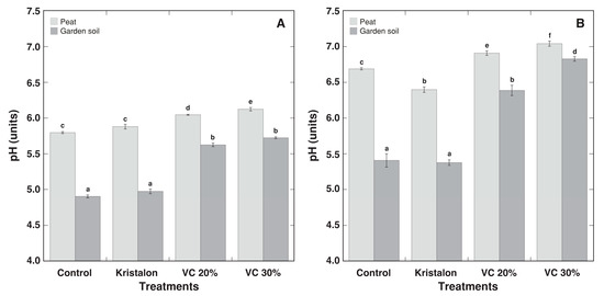 Effect of mineral fertilizer (Kristalon) and amendment with vermicompost (VC) at a 20% and 30% (v/v) rate on substrate pH for Dracocephalum moldavica plants grown in peat substrate or commercial garden soil for 1 week (A) and 8 weeks (B) after the start of the experiment. Results are means ± SE from five replicates for each treatment, four measurements per replicate. Means with identical letters are not considered statistically significantly different (p < 0.05).