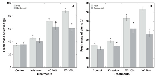 Effect of mineral fertilizer (Kristalon) and amendment with vermicompost (VC) at a 20% and 30% (v/v) rate on fresh mass of leaves (A) and stems with inflorescences (B) of Dracocephalum moldavica plants grown in peat substrate or commercial garden soil for 8 weeks. Results are means ± SE from five replicates for each treatment. Means with identical letters are not considered statistically significantly different (p < 0.05).
