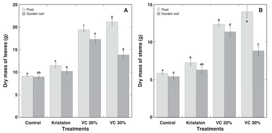 Effect of mineral fertilizer (Kristalon) and amendment with vermicompost (VC) at a 20% and 30% (v/v) rate on dry mass of leaves (A) and stems with inflorescences (B) of Dracocephalum moldavica plants grown in peat substrate or commercial garden soil for 8 weeks. Results are means ± SE from five replicates for each treatment. Means with identical letters are not considered statistically significantly different (p < 0.05).