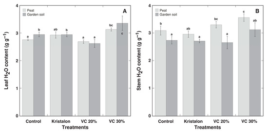 Effect of mineral fertilizer (Kristalon) and amendment with vermicompost (VC) at a 20% and 30% (v/v) rate on H2O content in leaves (A) and stems with inflorescences (B) of Dracocephalum moldavica plants grown in peat substrate or commercial garden soil for 8 weeks. Results are means ± SE from five replicates for each treatment. Means with identical letters are not considered statistically significantly different (p < 0.05).