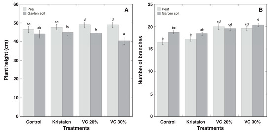 Effect of mineral fertilizer (Kristalon) and amendment with vermicompost (VC) at a 20% and 30% (v/v) rate on plant height (A) and number of branches (B) of Dracocephalum moldavica plants grown in peat substrate or commercial garden soil for 8 weeks. Results are means ± SE from five replicates for each treatment. Means with identical letters are not considered statistically significantly different (p < 0.05).