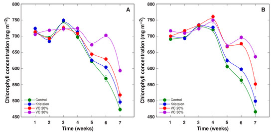 Leaf chlorophyll concentrations did not show any significant differences between treatments during four weeks of cultivation, where the concentration remained relatively stable (for plants in peat substrate) or showed an increasing trend (for plants in commercial garden soil) (Figure 8). Next, chlorophyll concentration decreased for plants in all treatments; however, the rate of decrease differed between the treatments, with more stable chlorophyll content for vermicompost-amended plants. As a result, there was no overall significant effect of vermicompost amendment on the chlorophyll concentration in both substrates (Table 2).