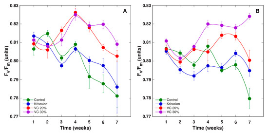 Changes of chlorophyll a fluorescence parameter Fv/Fm as affected by mineral fertilizer (Kristalon) and amendment with vermicompost (VC) at a 20% and 30% (v/v) rate in Dracocephalum moldavica plants grown in peat substrate (A) or commercial garden soil (B). Results are means ± SE from five replicates for each treatment, three measurements per replicate.