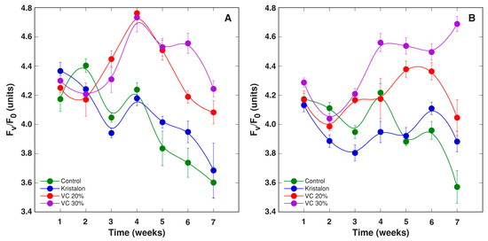 Changes of chlorophyll a fluorescence parameter Fv/F0 as affected by mineral fertilizer (Kristalon) and amendment with vermicompost (VC) at a 20% and 30% (v/v) rate in Dracocephalum moldavica plants grown in peat substrate (A) or commercial garden soil (B). Results are means ± SE from five replicates for each treatment, three measurements per replicate.