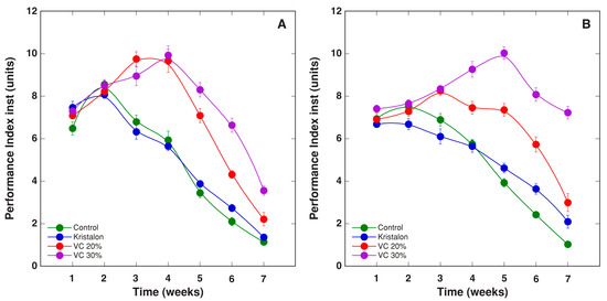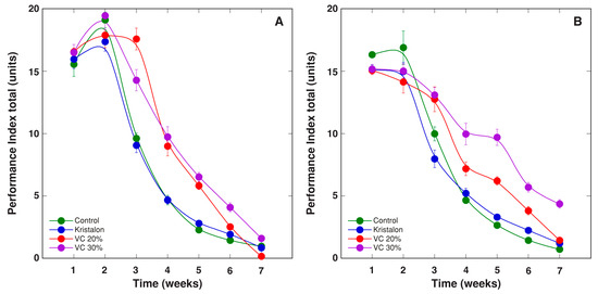 The chlorophyll a fluorescence parameter PItotal showed a pronounced decrease with plant age for all treatments, but some differences were evident between them (Figure 13). For plants grown in peat, the vermicompost amendment resulted in significantly higher PItotal during weeks 3–5, but there were no statistically significant differences between plants at two amendment rates (Figure 13A). For plants grown in soil, the vermicompost amendment resulted in significantly higher PItotal during weeks 3–6, and plants at a 30% amendment rate had significantly higher parameter values during weeks 4–7 (Figure 13B). However, the overall effect of treatments was not significant (Table 2).