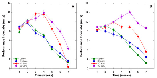 Changes of chlorophyll a fluorescence parameter PIabs, as affected by mineral fertilizer (Kristalon) and amendment with vermicompost (VC) at a 20% and 30% (v/v) rate in Dracocephalum moldavica plants grown in peat substrate (A) or commercial garden soil (B). Results are means ± SE from five replicates for each treatment, three measurements per replicate.