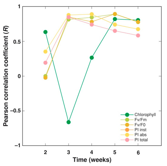 To further analyze the possible contribution of chlorophyll concentration and a particular chlorophyll a fluorescence parameter to plant yield, as affected by different cultivation substrates, a correlation between the value of each physiological indication at each particular week of cultivation and each of four yield parameters (fresh and dry mass of leaves and stems) was calculated (Figure 14). The highest correlation between leaf chlorophyll concentration and yield was during weeks 5–6, evidently reflecting a delay of the senescence of plants grown in the vermicompost-amended substrate. In contrast, all fluorescence-derived parameters showed a high correlation with the yield at week 3, with pronounced differences between the parameters during the further cultivation period. Both PIinst and PIabs were the parameters with the highest degree of correlation during weeks 3–4; the correlation with Fv/Fm and Fv/F0 peaked at week 5, but the correlation with PItotal steadily decreased (Figure 14).