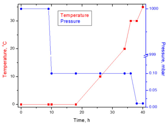 The obtained wet yeast biomass was dried by lyophilization. The operational drying parameters were the lyophilization time, freezing temperature, and pressure. The wet yeast biomass was poured into glass Petri dishes, with a capacity of 200 mL, and dried by lyophilization, using the Delta LSC 2-24 Martin Christ lyophilizer (Osterode am Harz, Germany), following the program presented in Figure 1.