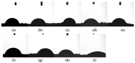 CA (Y3) remains one of the crude indicators for the wettability degree [25]. However, evaluating the CA for powders remains a challenge because powders are mostly heterogeneous, have a rough surface, and can undergo rapid property changes [26]. There are various different approaches for CA assessment [27], but the classic technique using a sessile or pendant drop remains the first choice as a result of its simplicity and reproducibility [28]. The images of the drop shape assessed for the wet biomasses are shown in Figure 2a–i, corresponding to the contact angle listed in Table 3.