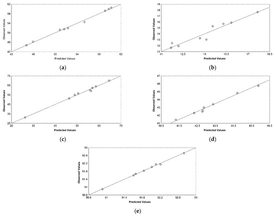 The experimental values of the responses obtained by applying these combinations of cultivation condition are given in Table 6, together with the predictive values obtained by applying the regression models (Equations (1)–(5)).