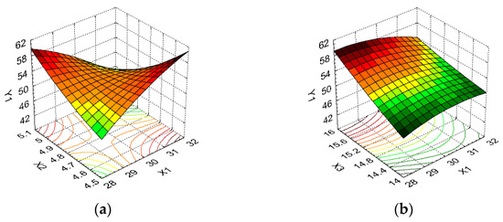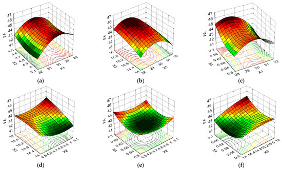 The influence of the cultivation conditions on the responses in the biotechnological processing of brewer’s yeast is also reflected in the regression models from Equations (1)–(5). These regression models, through the values of the coefficients of the regression terms, show the quantitative effects of the independent variables (in linear and quadratic form), and the interactions between them, on the system responses (Yi). For a response to be maximized (X1, X2, X4, and X5), the positive coefficient values indicate a synergistic effect, while negative values denote an antagonistic effect.