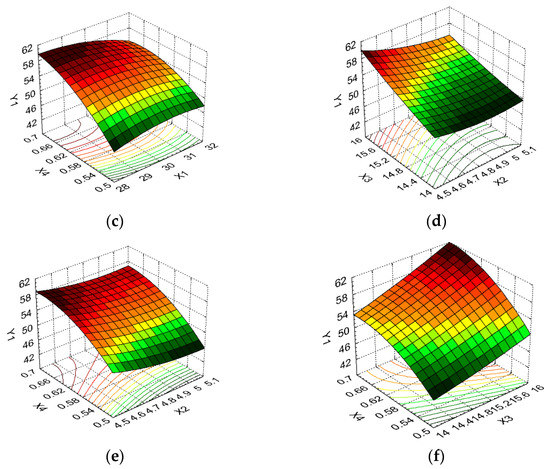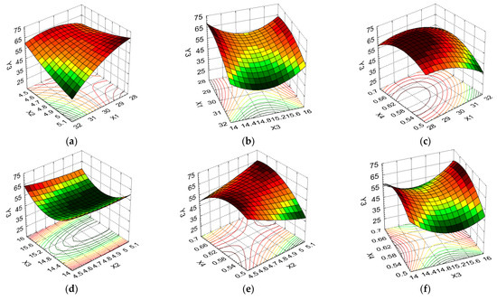 From Figure 7a, it is observed that the maximum temperature and pH levels result in low contact angle values, with the values of this response increasing more than twice for X1 at the minimum level when X2 was kept at the maximum level. Figure 7b indicates that the maximum temperature level caused low CA values when the carbon source was at the average level, with the minimum and maximum X3 levels resulting in significant increases in the CA for the same level of variation in X1. Increased, undesirable CA values were induced by the temperature variation from the maximum level to the average level, and the preservation of the nitrogen source at the average level (an increase of 1.16 times), according to Figure 7c. Figure 7d shows that Y3 was more influenced by the variation in the formulation variable X3 than X2, with favorable CA values being noted for the maximum pH level and average carbon source values. Figure 7e indicates that the minimum nitrogen source level in combination with the maximum pH level led to the minimum CA value, with the variations of these formulation variables being antagonistic. Thus, the CA value decreased from 62.44 to 31.05 (50.27%) for the variation in the pH between the minimum and maximum levels when the nitrogen source was kept at the minimum level; moreover, it increased from 54.97 to 64.05 (16.52%) for the same direction of X2 variation. Figure 7f indicates that the variation between the minimum and maximum levels of the carbon source formulation and nitrogen source variables had a similar influence on the CA; it further indicates that the average X4 values determine the increase in Y3 values, while the average X3 values favored the decrease in the values to this response.