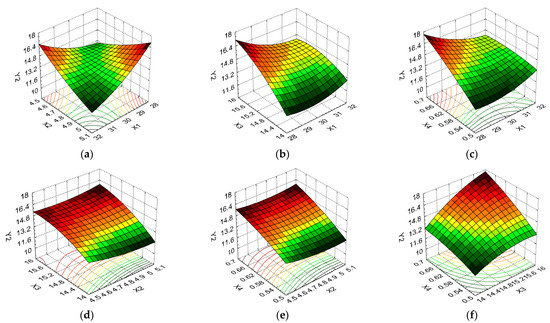 Figure 8a–c indicate that elevated protein content values were induced by the average temperature in combination with pH, carbon source, and nitrogen source at all levels of variation. For all these formulation factor combinations, the PC had a low variation, i.e., between 43.41% and 45.74% (5.37%). From Figure 8d, it can be seen that, for the maximum pH and carbon source levels, a high PC was obtained, with the formulation variable X3 having a greater influence on this response. Figure 8e indicates that a high PC was determined by the minimum and maximum pH and nitrogen source levels, with the average levels of these formulation variables causing the Y4 value to decrease from 45.74% to 42.48% (decrease of 7.13%). Regarding the combination of carbon source/nitrogen source formulation factors (Figure 8f), the maximum level of both formulation variables favored high PC values, i.e., 44.83%, which decreased to 43.41% for X3 at the minimum level and X4 at the average level (a decrease of 3.17%).