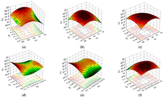 To determine the reduced quadratic polynomial models for the system responses, a stepwise regression analysis was performed with the backward elimination subroutine. These reduced regression models are presented as Equations (1)–(5), in which only significant terms (p < 0.05) were kept.