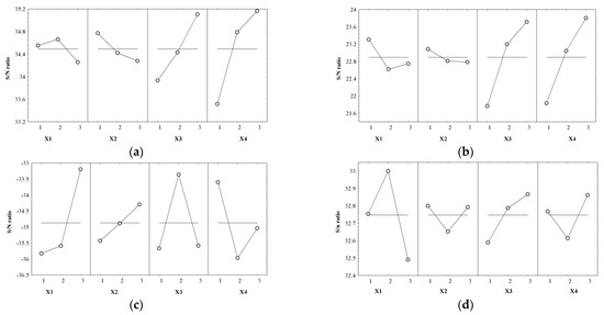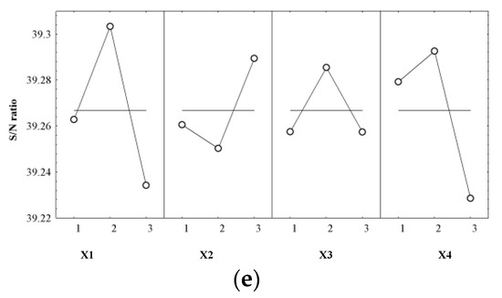 As a final step in determining the quality of the optimization process, the influence of controlled factors (Yi) on the signal-to-noise ratio (S/N) for each response was evaluated, resulting in the optimal combination of cultivation conditions (Table 5 and Figure 10a–e).