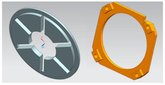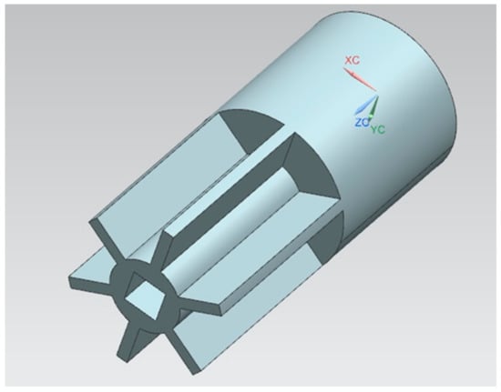 The garlic plant spacing of a = 14 cm and = 12% are selected. Under the same operation speed and plant spacing, the number of shaped holes having the same diameter is inversely proportional to the linear speed. That is, when the number of shaped holes is large, the linear speed is low, and the filling performance of the shaped holes is good. By substituting the above-mentioned values in Equation (10), we obtain m = 6, and the number of shaped holes on the hole wheel is 6. The shape and size of the hole are designed by comprehensively considering the shape and size of the seed and the number of holes required; subsequently, the structure of the hole wheel is designed. According to the above calculation, the diameter of the hole wheel is 70 mm, the diameter of the hole is 40 mm, the length of the hole shaft is 32 mm, and the total width of the hole wheel is 156 mm. Figure 2 shows the three-dimensional structure of the designed hole wheel [26,27,28,29].
