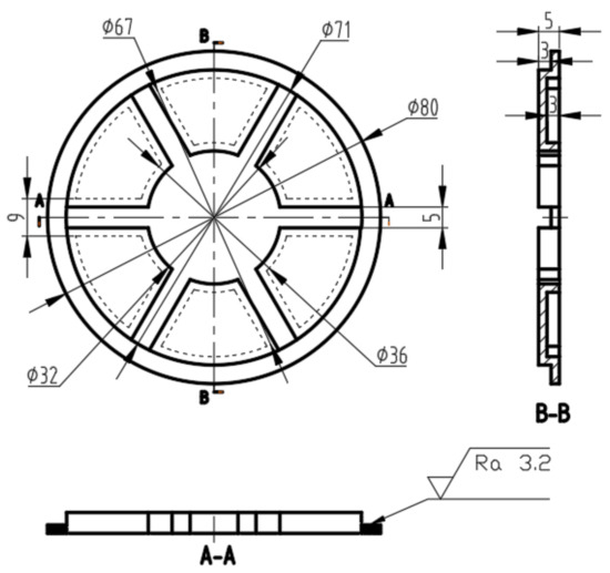 As shown in Equation (11), the garlic seed movement speed relative to the ground is approximately zero, which can make the angle small, even if the wrapping angle of the seed guard plate is large. Considering that there is a lag when the seed falls out of the hole, the wrapping angle, , should be slightly greater than zero: = 10°–15° is sufficient. Then, according to the overall dimension of the brush, the length of the seed guard plate is designed to be 75 mm and the thickness is 3 mm. The structural diagram and three-dimensional diagram of the seed guard plate are shown in Figure 4, Figure 5 and Figure 6. In Figure 4, A-A and B-B are the structural diagrams of the inner baffle of the seed guard plate.