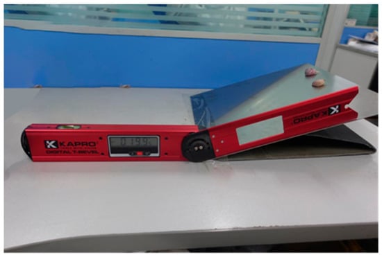 The experimental setup includes a working face, an angle measuring instrument, and an angle adjusting mechanism. The coefficients of static friction between the garlic clove and the stainless-steel plate and between the garlic clove and the polyoxymethylene plate were measured by the inclined method. The experimental device is shown in Figure 7.