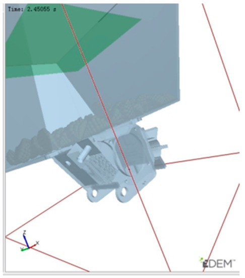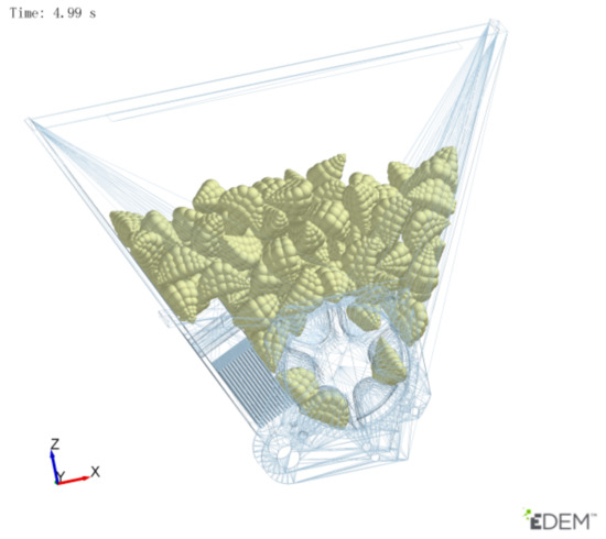 In the discrete element simulation calculation, the display mode is set to mesh mode, in which the movement of seeds in the seed box and seed metering device can be clearly seen. The simulation result is shown in Figure 11.