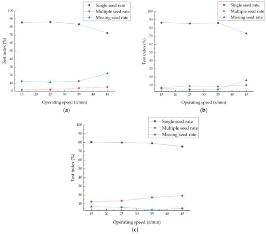 The adjustment size, L, ranged from 0 to 75 mm. In the actual production process, for different varieties of garlic, the process of selecting the adjustment size is more complex and requires several experiments and a long time. Therefore, a simulation experiment is beneficial to determine the operating parameters, speed, and adjustment size of the mechanism. When the adjustment length is 35 mm (a), 40 mm (b) and 45 mm (c) respectively, the virtual simulation experiment results of the seed metering mechanism at different speeds are as shown in Figure 13.