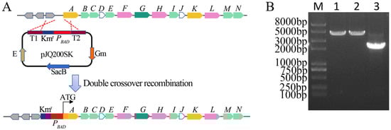 As described above, despite multiple efforts were attempted to increase the yield of Xcn1, it still cannot meet the requirement of industrial production. Therefore, new strategies for engineering the production strain, which might complement previous endeavors, should be attempted. Replacement of the natural promoter of a gene cluster of interest with a strong constitutive promoter or an inducible promoter whose regulation mechanism is well understood could be an effective strategy to improve the yield of the aimed secondary metabolite [,]. It has been reported that the well-known PBAD promoter was used successfully to improve the production of secondary metabolites in the entomopathogenic bacteria Photorhabdus luminescens and Xenorhabdus doucetiae []. Hence, we speculate that replacement of the original promoter of xcnA with the PBAD promoter could be an useful strategy to improve the yield of Xcn1. Therefore, in this study, we constructed a ΔPBAD-xcnA mutant based on X. nematophila CB6 and studied its effects on Xcn1 production and antimicrobial activity.