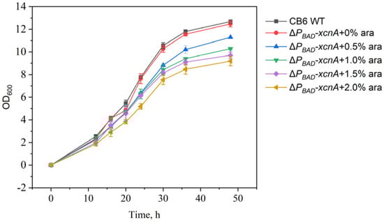 Growth curves of ΔPBAD-xcnA mutant strain, adding different concentrations of L-arabinose and wildtype CB6 strain.