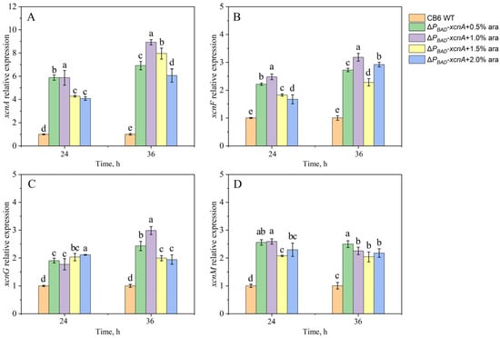 To evaluate the xcn genes’ transcription levels of the ΔPBAD-xcnA mutant in different L-arabinose concentrations, qRT-PCR was employed to monitor the four critical genes (xcnA, xcnF, xcnG, and xcnM) during the fermentation process (Figure 4). Consistent with our expectations, induced by L-arabinose, all of the four genes in the ΔPBAD-xcnA mutant showed higher transcription levels relative to the wildtype CB6 strain at both 24 h and 36 h. It is worth noting that the expression levels of xcnA, encoding the important NRPS enzyme responsible for Xcn1 biosynthesis, in the ΔPBAD-xcnA mutant were enhanced 7-fold, 9-fold, 8-fold, and 6-fold at 36 h with addition of 0.5%, 1.0%, 1.5%, and 2% L-arabinose, respectively. Another crucial gene xcnF, encoding a PKS enzyme involved in Xcn1 biosynthesis, was also highly upregulated with 2.7-fold, 3.2-fold, 2.3-fold, and 2.9-fold increase at 0.5%, 1.0%, 1.5%, and 2% L-arabinose, respectively. The transcription levels of xcnG, encoding a specific peptidase that can cleave the inactive prexenocoumacins into the active compound Xcn1, were increased at 36 h by 2.4-fold, 3.0-fold, 2.0-fold, and 1.9-fold, respectively. The over-transcription of xcnA, xcnF, and xcnG, involved in Xcn1 biosynthesis, was in concert with the observed higher Xcn1 yield produced by the ΔPBAD-xcnA mutant. The transcription level of the xcnM gene was increased by 2.5-fold, 2.3-fold, 2.0-fold, and 2.2-fold at 36 h with the addition of 0.5%, 1.0%, 1.5%, and 2% L-arabinose, respectively. It led to a higher conversion rate from Xcn1 to Xcn2, therefore, increased Xcn2 yield.