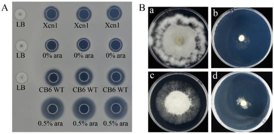 The antimicrobial activity of wild type CB6 strain and ΔPBAD-xcnA mutant strain on B. subtilis and P. capsici. (A) Antibacterial activity was studied by agar diffusion plate assay using B. subtilis as the indicator. Xcn1 represents 50 μg/mL Xcn1, CB6 WT represents the cell-free fermentation broth of wild type strain, 0% ara and 0.5% ara represent the cell-free fermentation broth of uninduced and induced ΔPBAD-xcnA mutant, respectively. (B) Antifungal activity of ΔPBAD-xcnA mutant was assessed by growth inhibitory assay using P. capsici as the indicator. (a) control, (b) 137-fold dilution of the fermentation broth of wild type CB6 strain mixed with PDA medium with a final concentration of 0.5 μg/mL of Xcn1, (c) 137-fold dilution of the fermentation broth of uninduced ΔPBAD-xcnA mutant mixed with PDA medium, and (d) 500-fold dilution of the fermentation broth of ΔPBAD-xcnA mutant induced by 0.5% L-arabnose mixed with PDA medium with a final concentration 0.5 μg/mL of Xcn1.