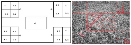 As shown in Figure 3, the image is divided into five blocks. Block 1 is a rectangle of size 1024 × 768, and blocks 2, 3, 4, 5 are four square areas of size 1600 × 1600 pixels at the corner of the image, which is divided into four equal squares (sub-blocks) and numbered in turn.